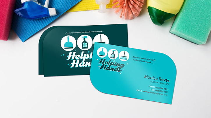 These business cards are fairly unique. The standard rectangular card is offset with a single striking rounded corner. It’s unconventional, creative, and absolutely attention-grabbing. A single corner business card is a great option for businesses that really want to stand out from the competition. If you’re looking for business card ideas for lawn care, plumbing, general contractors, or similar trades, this could be a great way to brand your business so that it stands out.